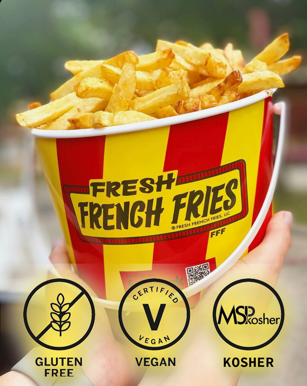 We're also happy to announce that Fresh French Fries is gluten-free and kosher-certified! After the spuds are washed, peeled, and cut, they're cooked in gluten-free and trans-fat-free vegetable oil, then topped with a light dusting of salt. Ketchup and vinegar are available for dipping your delicious fries!